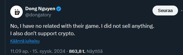 Päivitys 15.9. kello 18.11: Flappy Birdin alkuperäinen luoja Dong Nguyen on antanut ymmärtää Twitterin puolella, ettei hänellä ole mitään tekemistä uuden pelin kanssa ja että hän ei ole myöskään myynyt mitään eteenpäin kellekään.