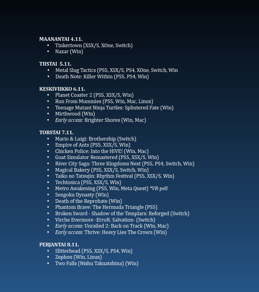 Poimintoja tämän viikon (45/2024) uutuuspelien tarjonnasta.