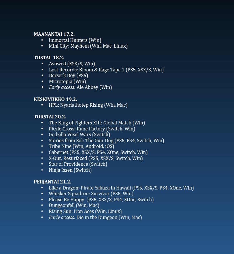 Poimintoja tämän viikon (08/2025) uutuuspelien tarjonnasta.