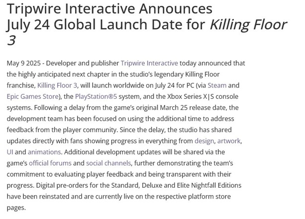 Aiemmin tänä vuonna lykkäyksen kokenut yhteistyöräiskintä Killing Floor III on saanut uuden julkaisupäivän. Kehittäjä Tripwire Interactive kertoo tuoreessa tiedotteessaan, että ammuskelun on määrä käynnistyä PS5:llä, Xbox Seriesillä ja PC:llä 24. heinäkuuta.