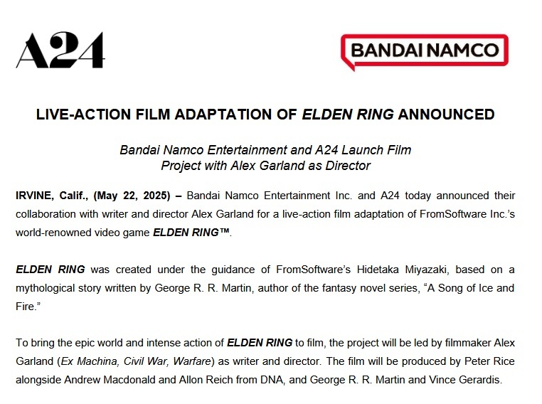 Elden Ring -elokuvasovitus on saanut virallisen vahvistuksen Bandai Namcolta sekä tuotantoyhtiö A24:ltä. Hankkeen ohjaa ja käsikirjoittaa Alex Garland (Ex Machina, Annihilation, Civil War). George R. R. Martinin ilmoitetaan olevan myös yksi tuottajista.