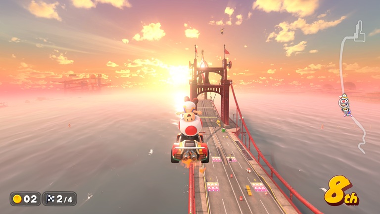 Yleisesti ottaen ydinteema kisaamisen takana on tällä kertaa siis lähempänä road trip -matkailua kuin perinteistä rata-ajelua. Tämä tarkoittaa, että toistot esimerkiksi pelaamisen varrella kohdattavissa mutkissa ja maisemissa ovat aiempiin Mario Kart -peleihin nähden selvästi vähäisempiä. Knockout Tourin konsepti yhdestä isosta pidempään jatkuvasta selviytymiskisasta on oikeasti myös todella mainio oivallus Nintendolta. Alati kutistuva osallistujamäärä tarjoaa jatkuvasti luonnollisesti muodostuvia dramaattisia taistelutilanteita, joissa tappiokaan ei niin kirpaise, sillä uuden kisan voi laittaa niin netissä kuin paikallisesti pelattuna pystyyn varsin vaivatta.
