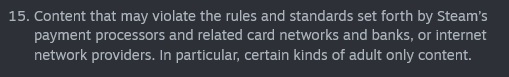 Valve näyttää päivittäneen Steamissa myytäviä pelejä koskevia sääntöjä ja ohjeistuksia. Tuoreen lisäyksen mukaan kauppapaikalla ei sovi julkaista ”sisältöä, joka voisi rikkoa Steamin maksunkäsittelijöiden, niihin liittyvien korttiverkostojen ja pankkien sekä internet-palveluntarjoajien sääntöjä ja käytäntöjä”. Erityisesti ”tietynlainen aikuissisältö” mainitaan tällaisena asiana.