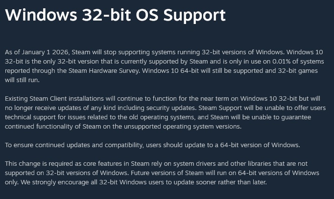 Steamissä lakkautetaan vuodenvaihteessa tuki 32-bittisille käyttöjärjestelmille, joista ainut tuettu onkin enää ollut Windows 10 32-bit. Valven kyselytietojen mukaan sitä on hyödyntänyt 0,01 prosenttia Steamia käyttävistä järjestelmistä. Windows 10 64-bitin ja 32-bittisten pelien tuki jatkuu normaalisti.