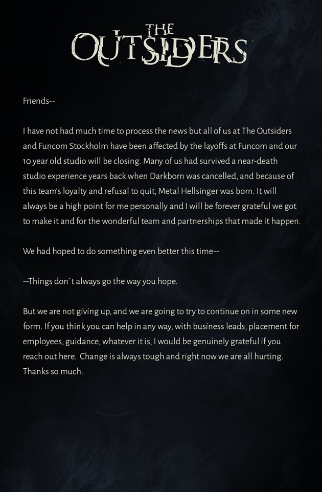 Metal: Hellsinger -kehittäjä The Outsiders sulkee ovensa Funcom-pelitalon hiljattain vahvistettujen irtisanomisten yhteydessä. Kymmenen vuotta pyörinyt tukholmalainen studio työsti aikoinaan myös hirviöpeli Darkbornia, jonka kohtalona oli kuitenkin peruuntuminen vuonna 2020. Studiota veti Battlefield– ja Payday 2 -konkari David Goldfarb.