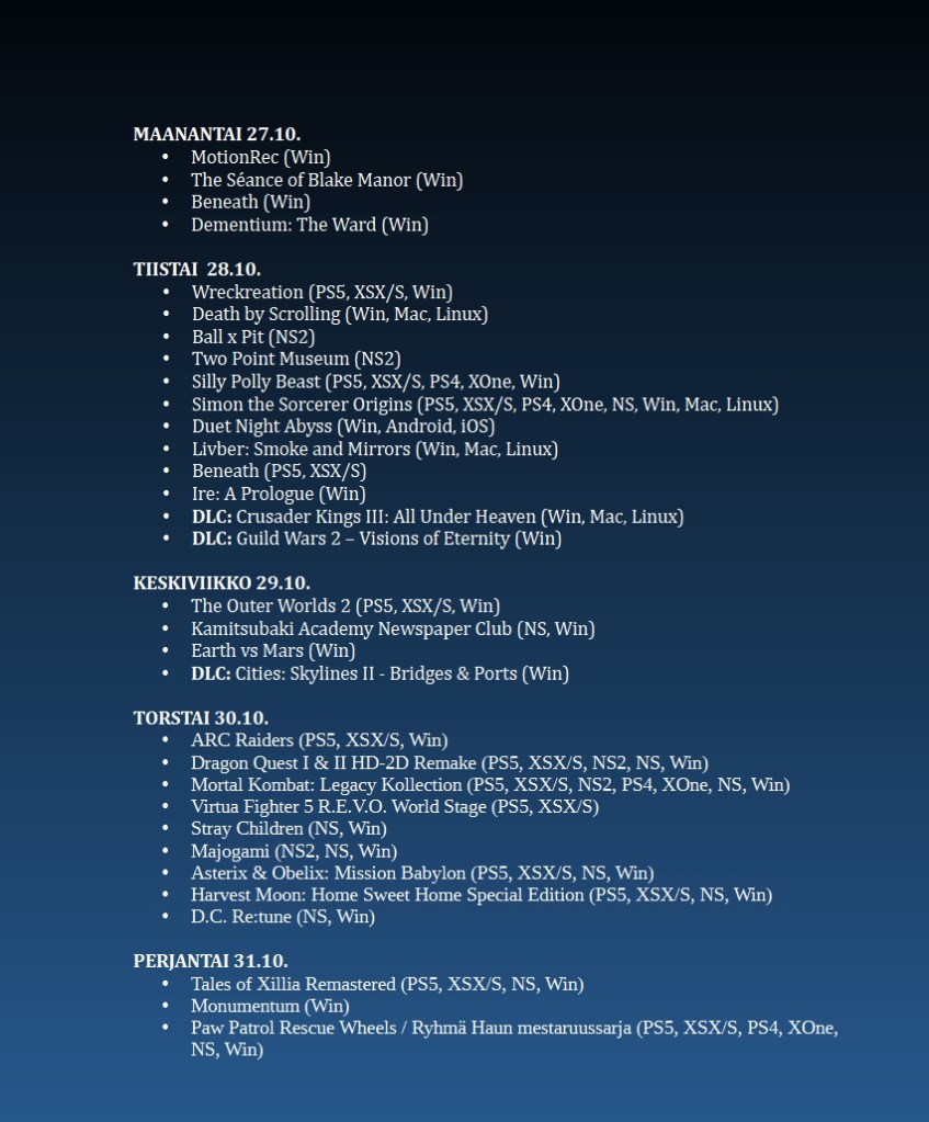 Poimintoja tämän viikon (44/2025) uutuuspelien tarjonnasta.