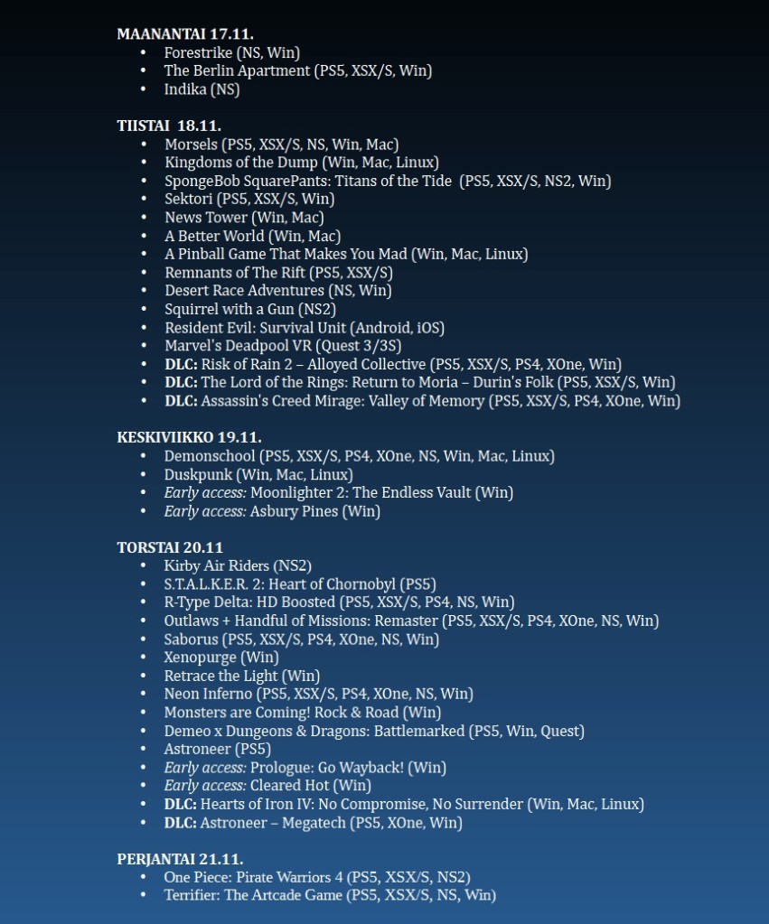 Poimintoja tämän viikon (47/2025) uutuuspelien tarjonnasta.